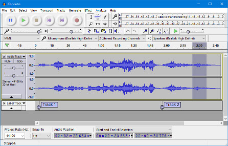 Areas of the audio that you want to work on, are just selected with the mouse, as in the grey stripe in the image above. So when you apply the filter, it will just apply it to that area. Zooming i and out so that you can view the sound file in greater detail and for more accurate editing is done using CRTL key and either 1 (Zoom in ), 2 (Normal View) or 3 (Zoom out).